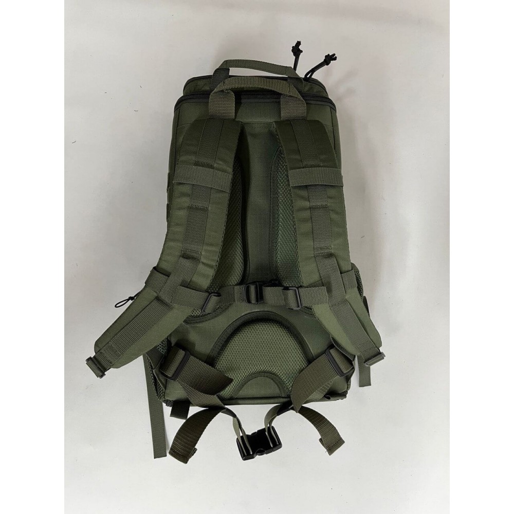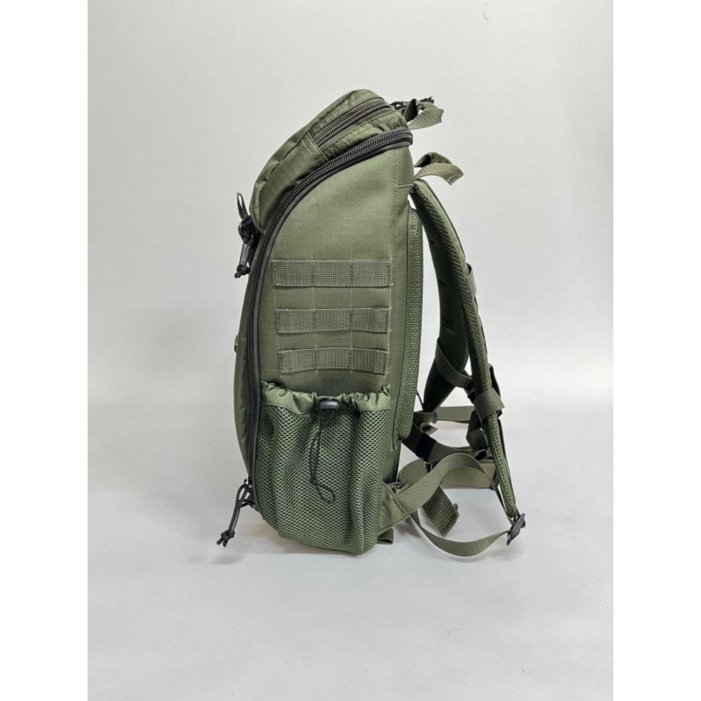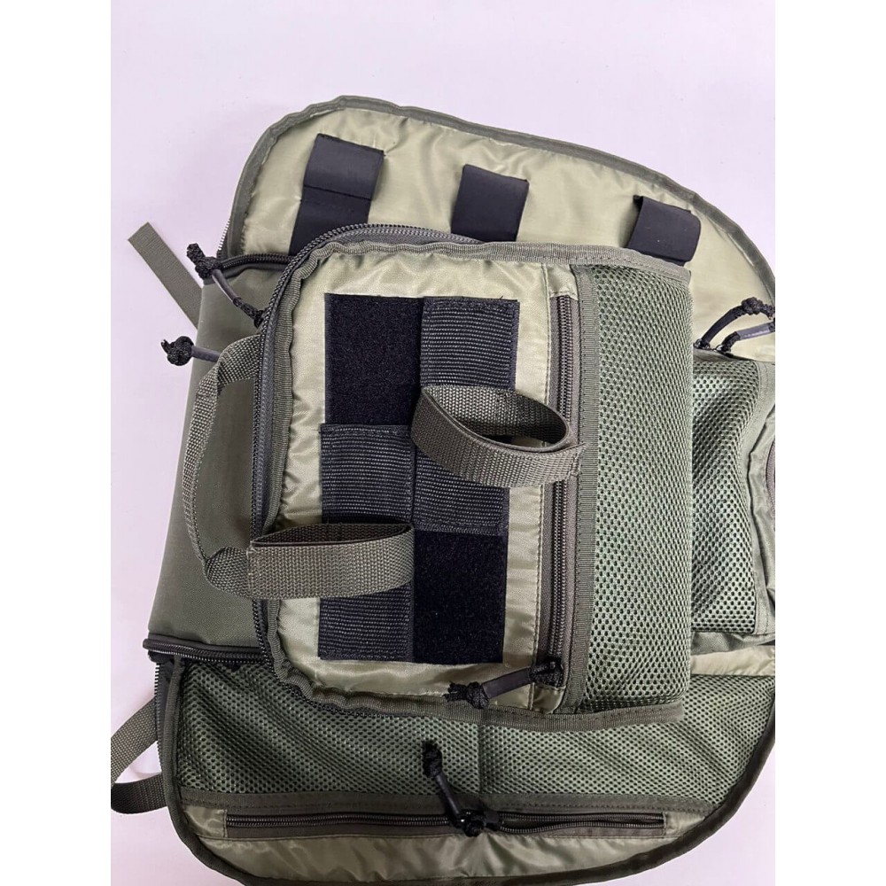 Рюкзак объёмом 27 литров оснащен одним основным отделением, которое раскрывается полностью, а также верхним, передним и боковыми карманами. В комплекте поставляются съемные подсумки/контейнеры, которые позволяют организовать медицинские принадлежности и инструменты внутри рюкзака.