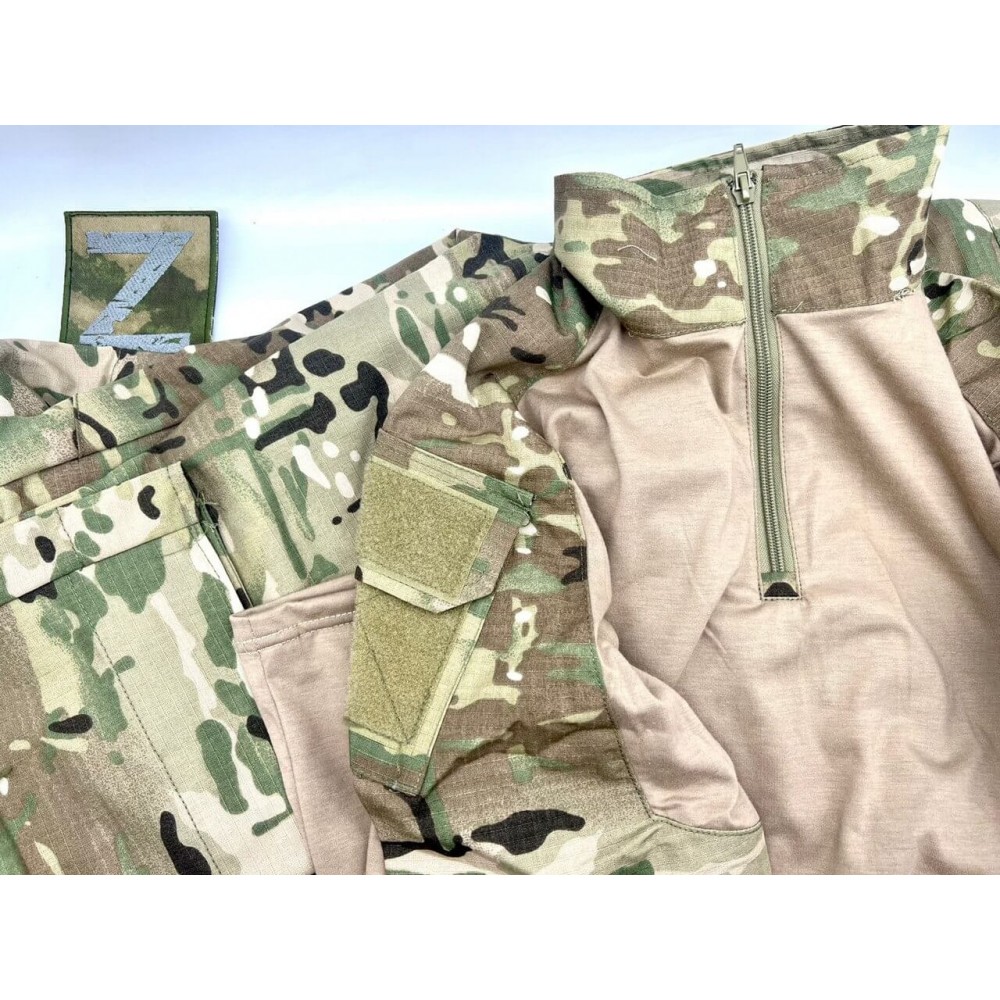 Боевая рубашка этого комплекта надевается через голову и носится в заправку. Она изготовлена из смесовой ткани, состоящей из однотонной трикотажной дышащей ткани для туловища (95% хлопок + 5% спандекс) и камуфляжной прочной ткани для рукавов (65% полиэстер + 35% хлопок). Такой состав материалов обеспечивает комфорт и прочность во время носки.