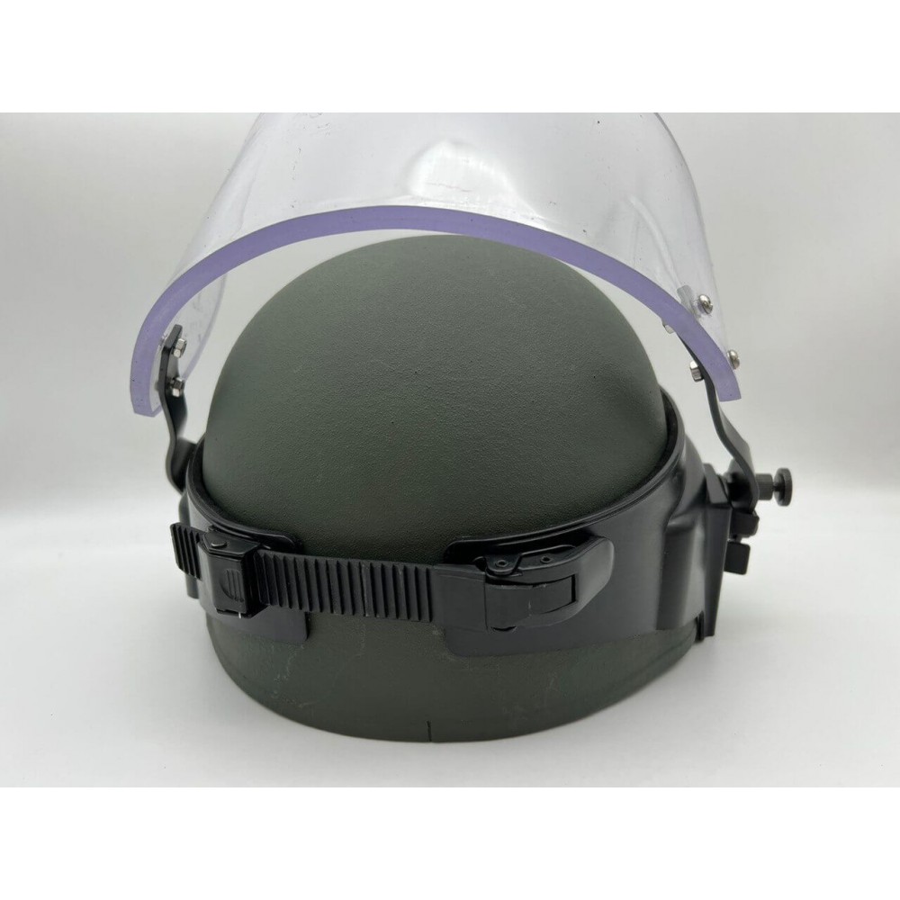 Защитный шлем изготовлен из композитного материала на основе 19 слоев арамида и СВМПЭ со специальной пропиткой фенольными смолами. Забрало защищает от попадания пистолетных пуль и осколков. Соответствует классу защиты NIJ IIIA. Толщина защитного экрана – 8 мм.
